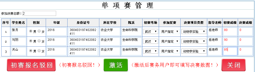 实现了用户竞赛进程快速交互交流、竞赛过程统一安排管理、竞赛评审公正管理、数据统计查询等功能。本系统结合了竞赛管理具体的工作情况,在设计上具有实用性及稳定性。